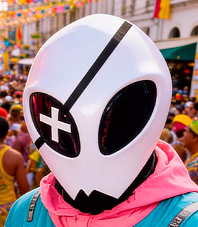 Textura e detalhes: dobras realistas do tecido, reflexos naturais na superfície da máscara do ET, alto alcance dinâmico, qualidade profissional de estúdio.